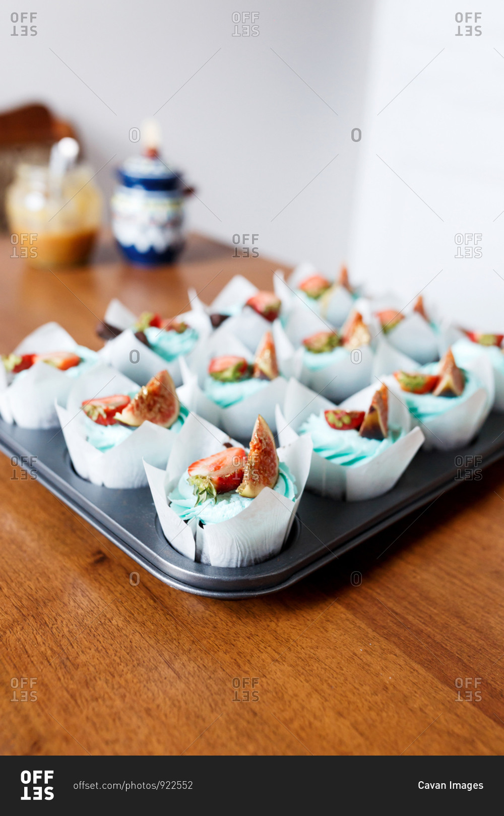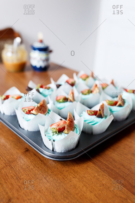 The plate of tasty cupcakes decorated with strawberry, fig and cream