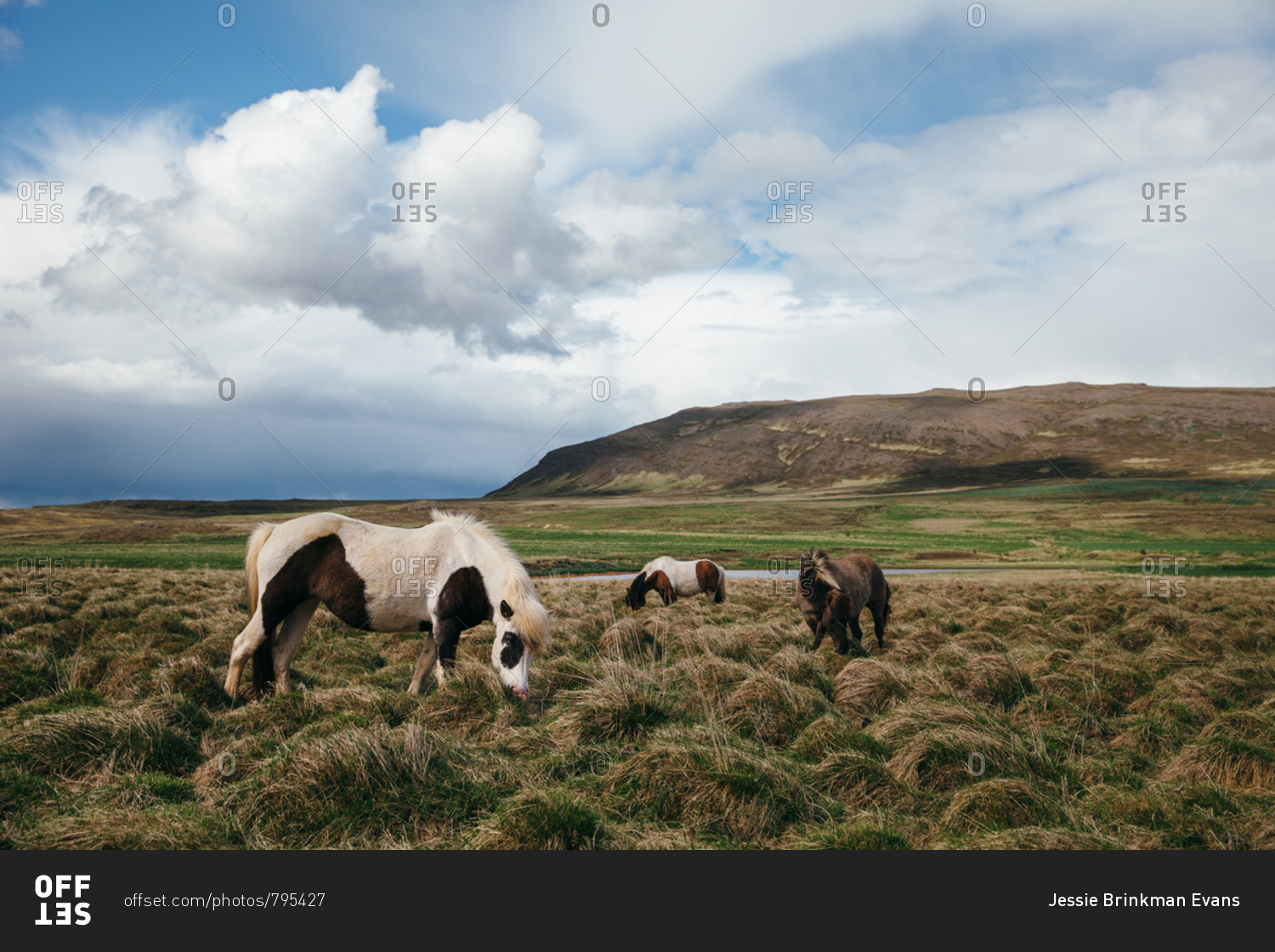 Three Icelandic horses grazing in the countryside