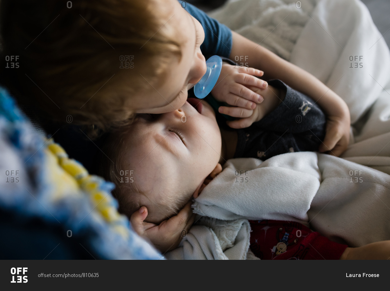 Toddler boy cuddling with his baby brother