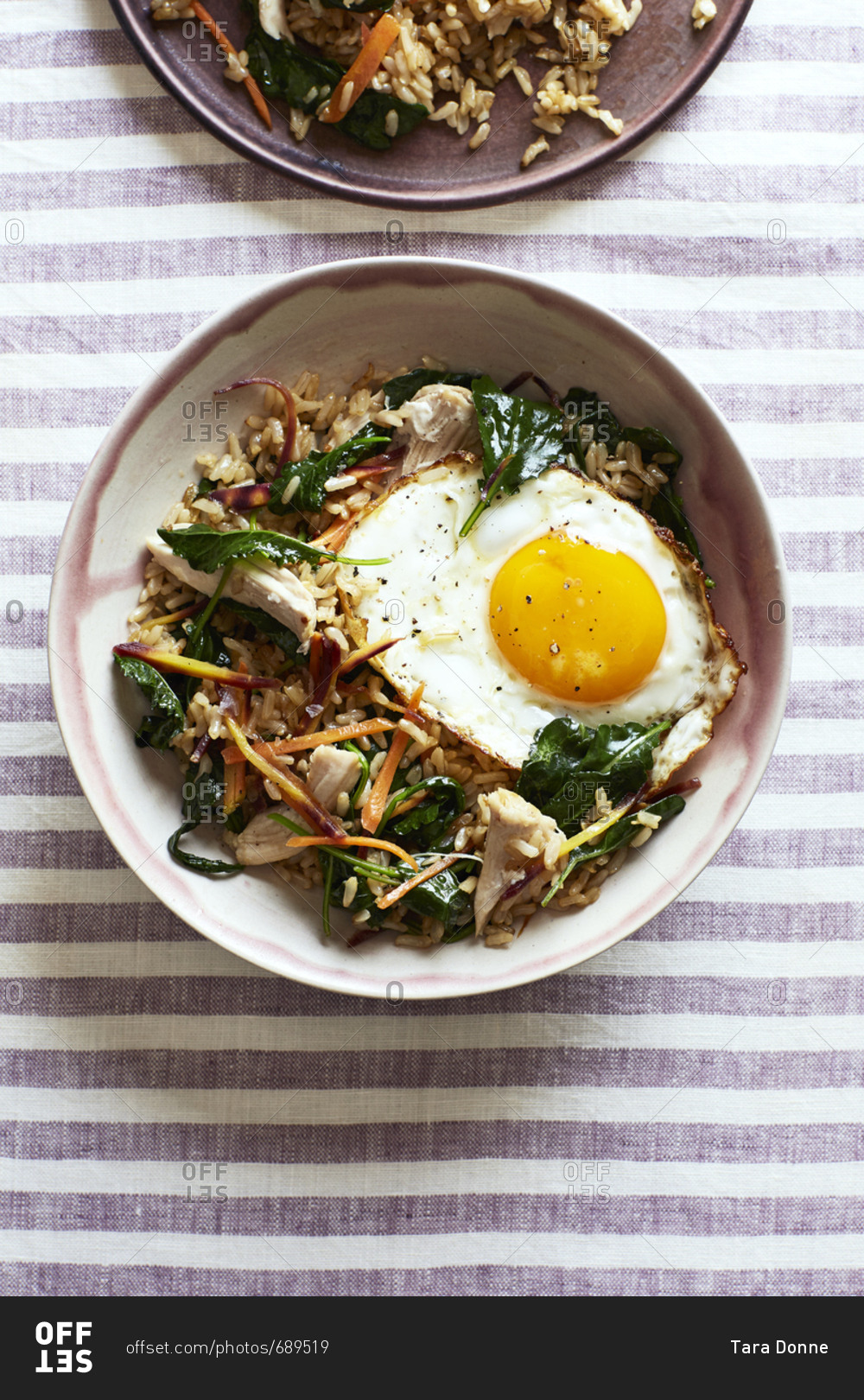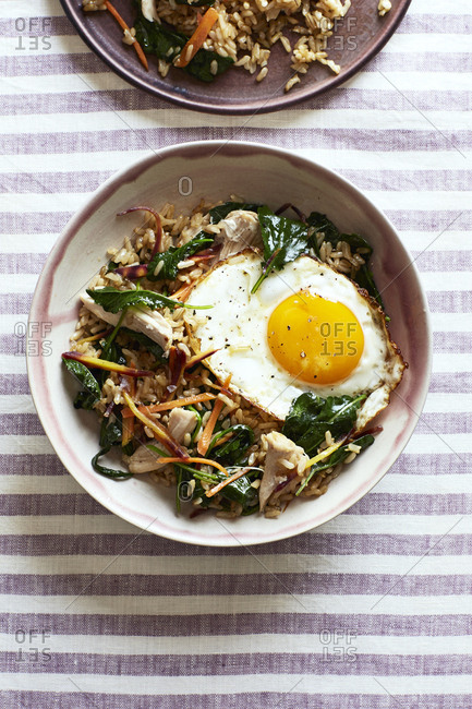 Top view of chicken fried rice topped with sunny-side-up egg on striped table cloth