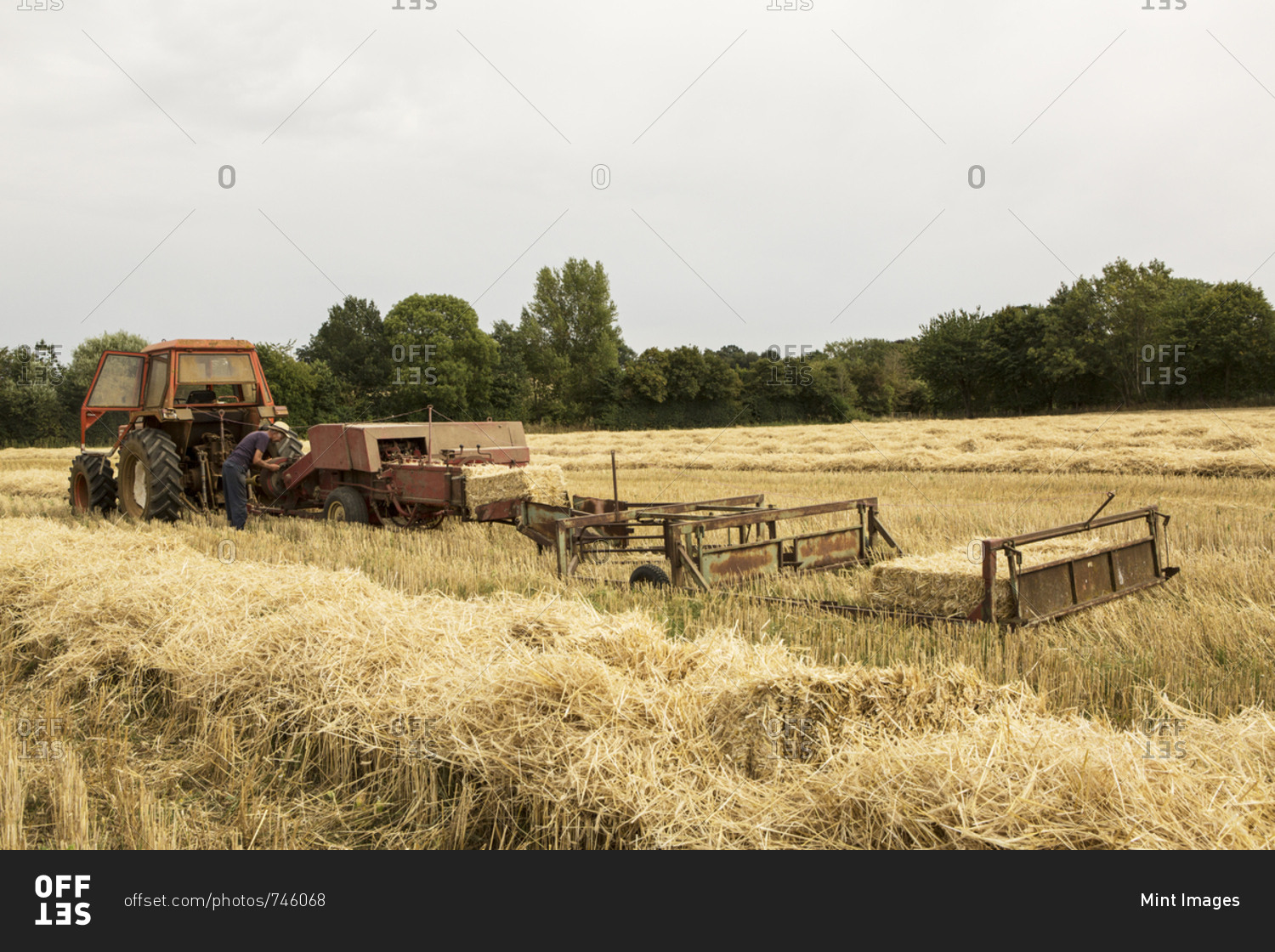 Tractor and straw baler in wheat field, farmer baling straw.