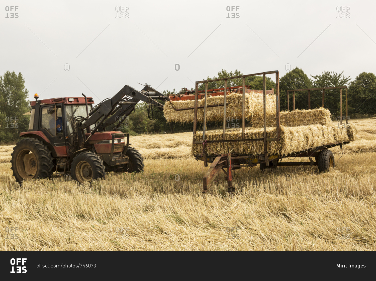Tractor and straw baler in wheat field, farmer baling straw.