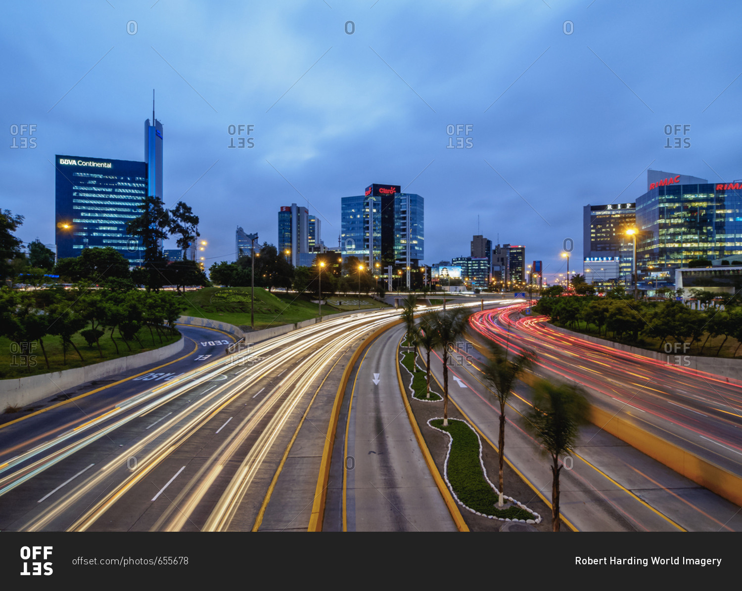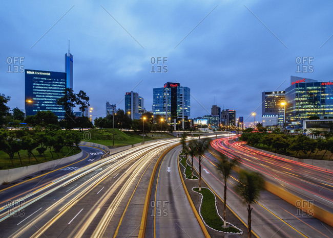 twilight, Lima, Peru, South America - January 24, 2017: Modern architecture in San Isidro District, twilight