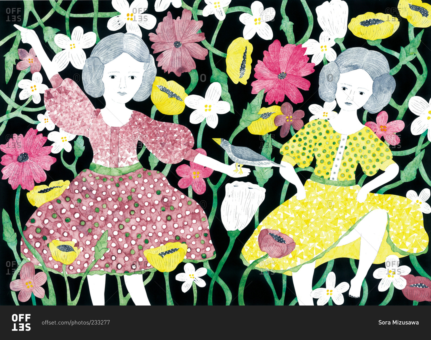 Two dancing girls and a bird among entwined flowers on black background