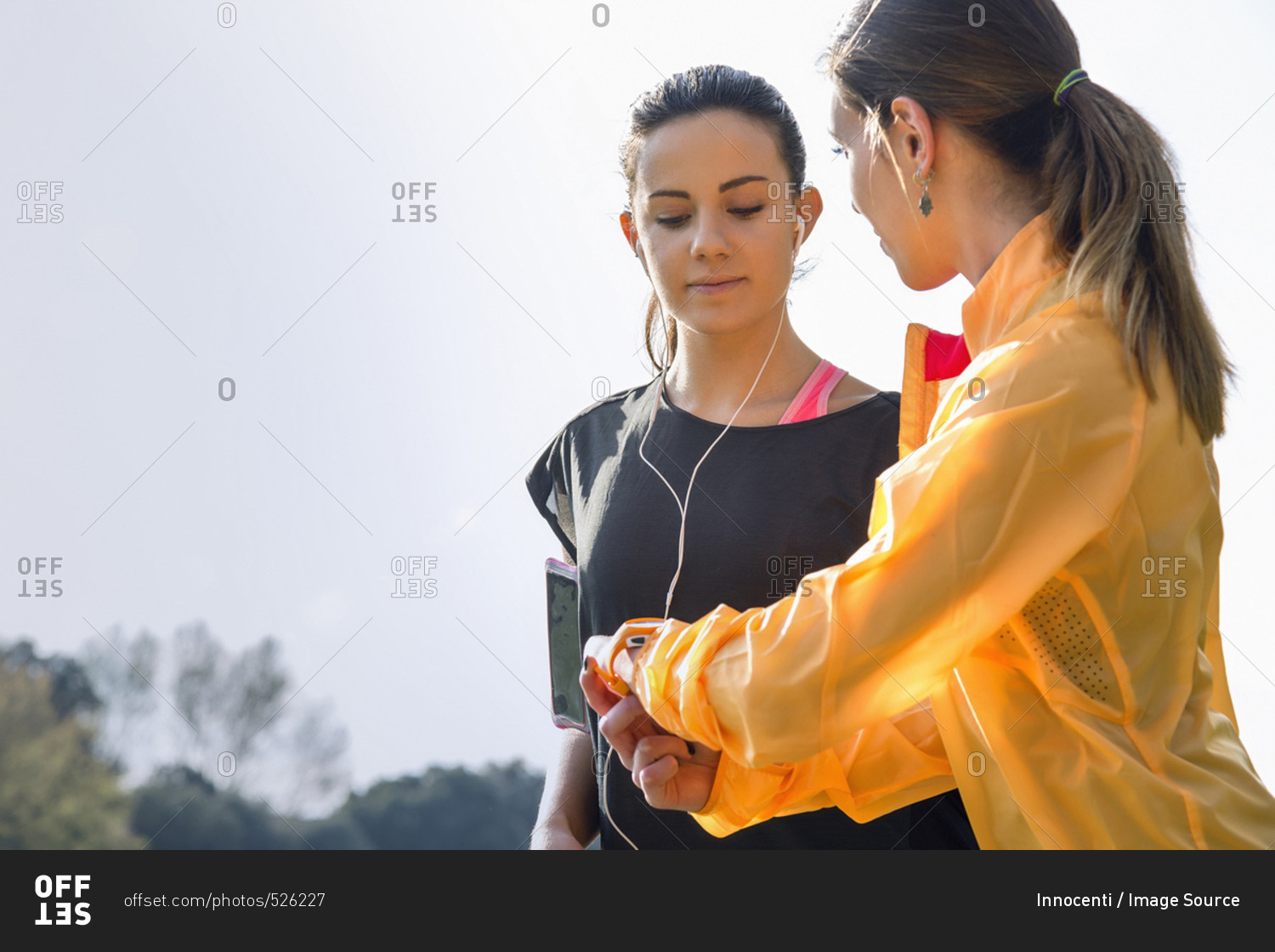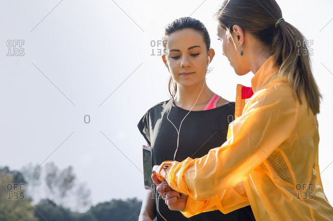 Two female friends outdoors, young woman showing friend activity tracker