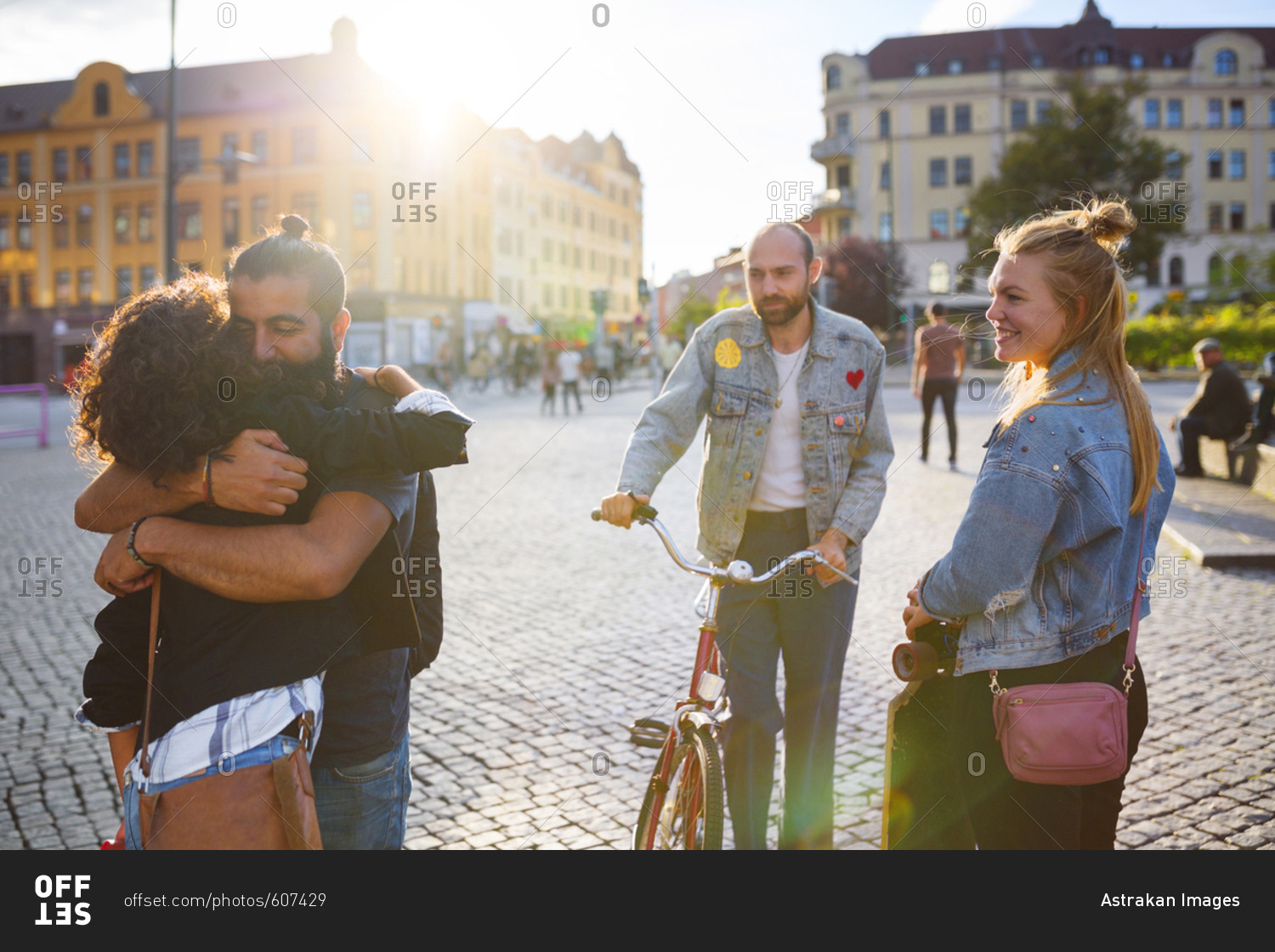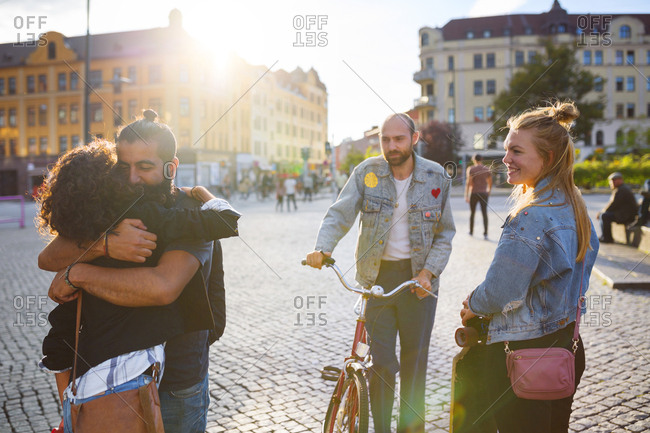 Two friends embracing and other friends smiling
