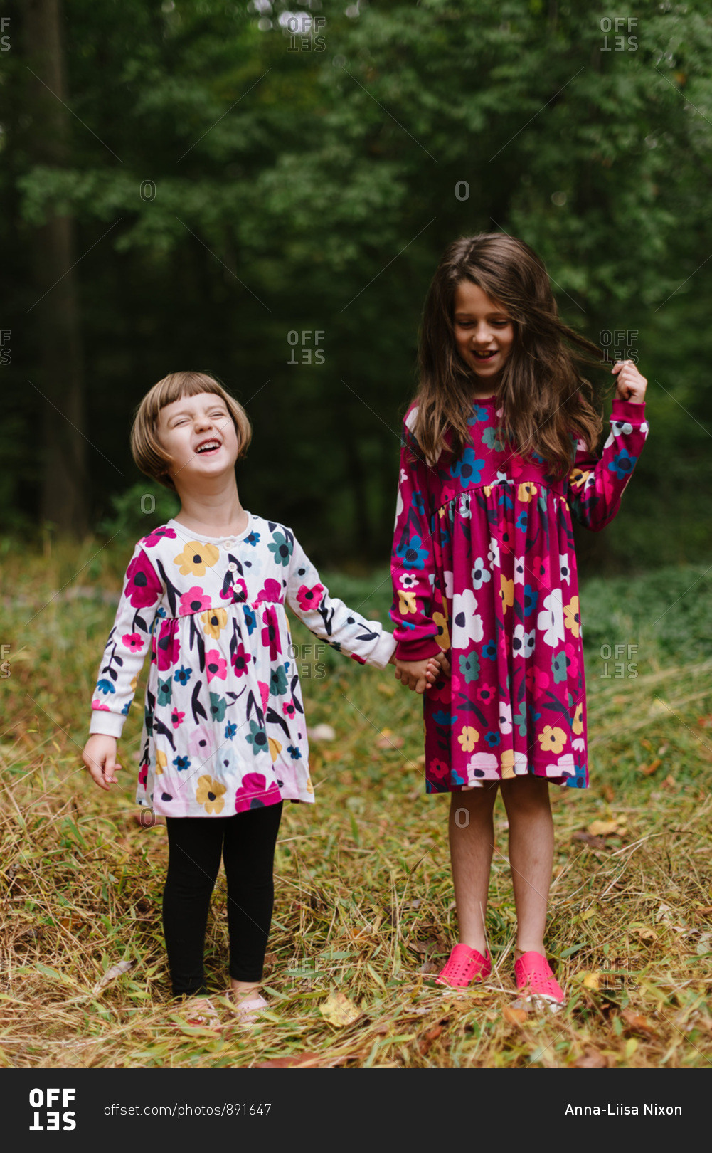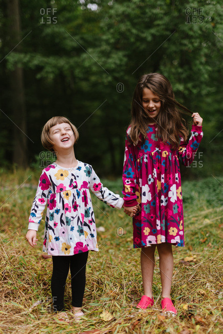 Two happy sisters in coordinating floral dresses in the woods