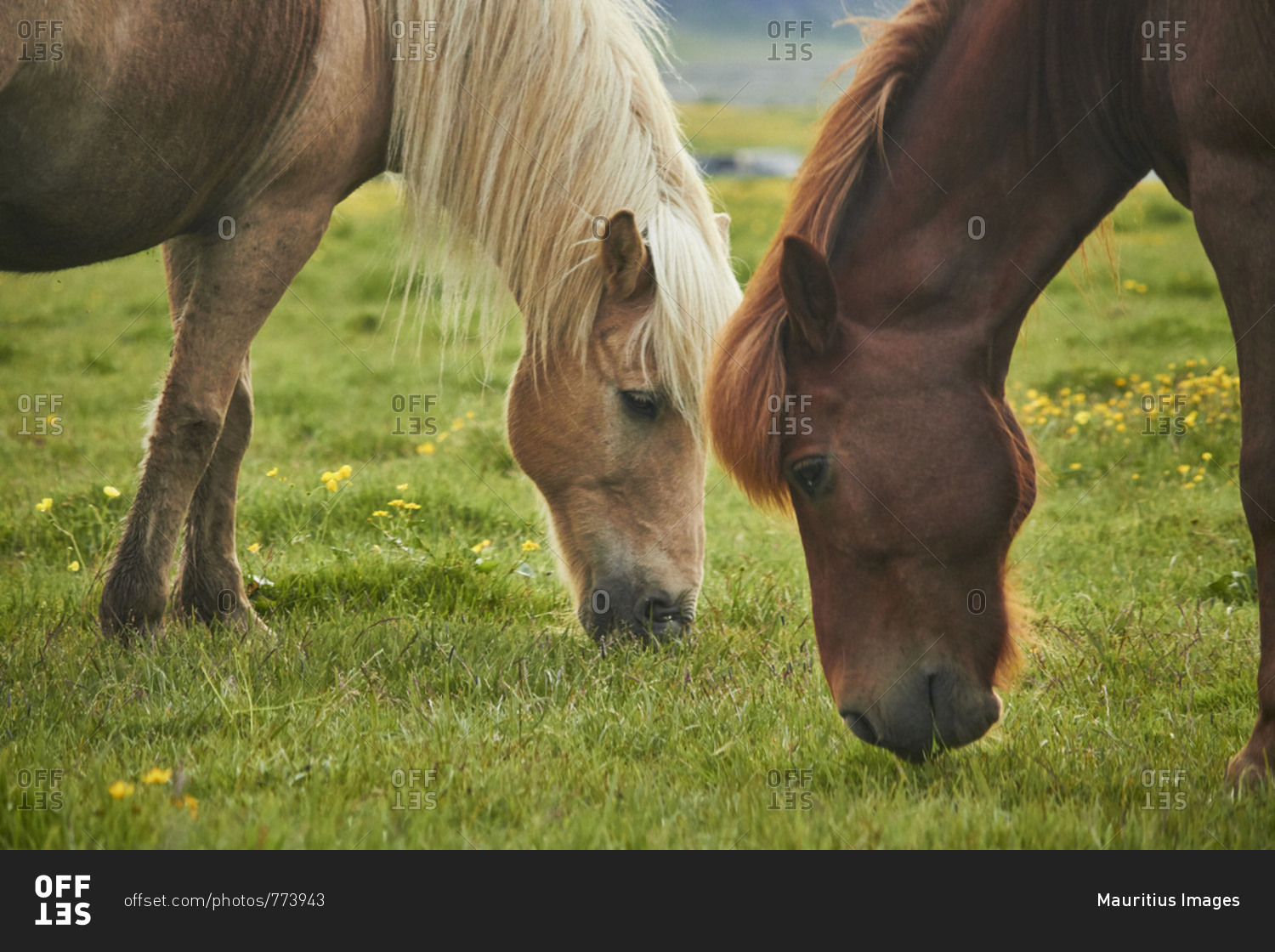 two Icelandic horses standing on a field grazing