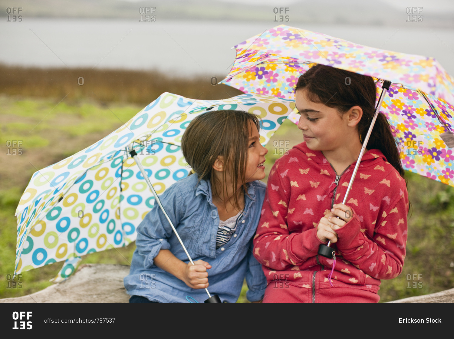 Two young girls smile and talk as they sit together on a fallen tree trunk while holding open umbrellas.