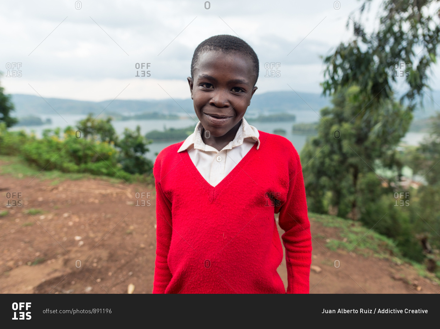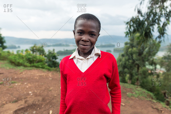 Uganda - November 26, 2016: Young African boy well dressed barefoot walking on dirt path in the middle of green forested hills in daytime