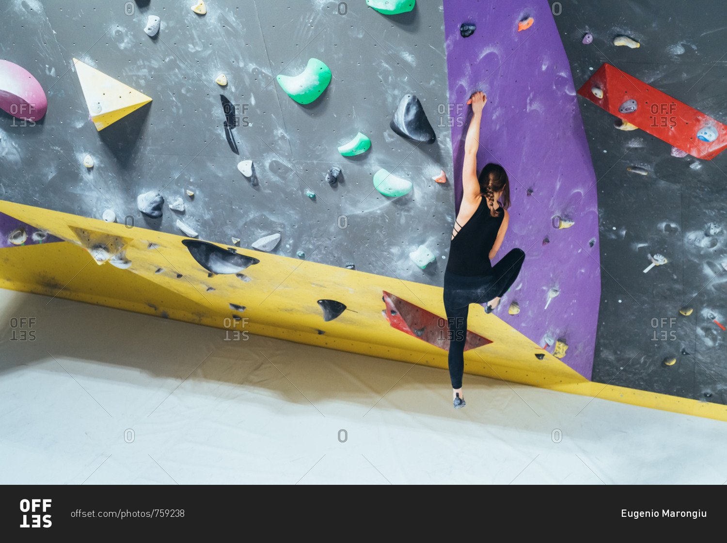 Unrecognizable young woman preparing himself in a climbing gym - preparation, concentration, sportive concept