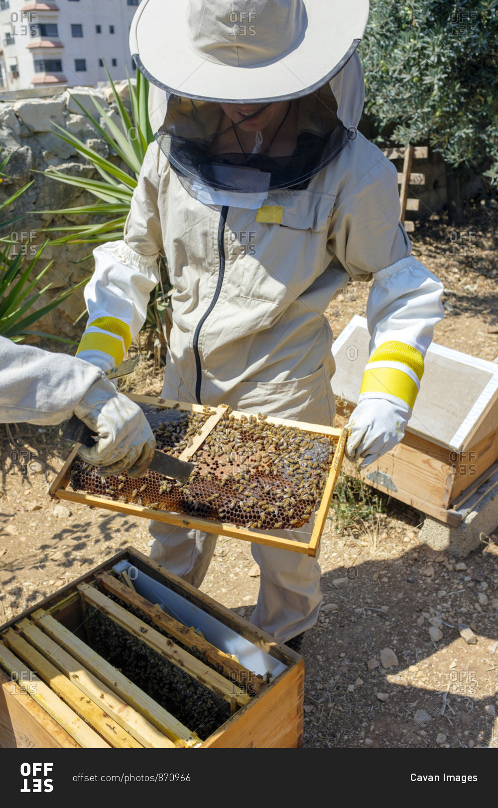 Urban beekeeper checking the hives, ramallah, west bank, palestine.