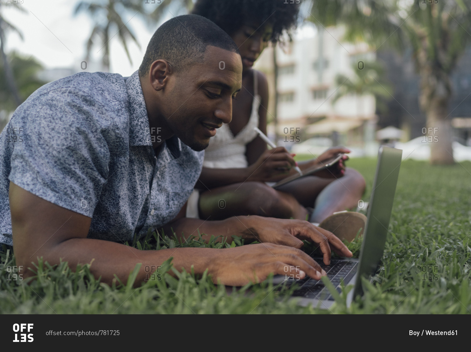 USA- Florida- Miami Beach- young couple using tablet and laptop on lawn in a park