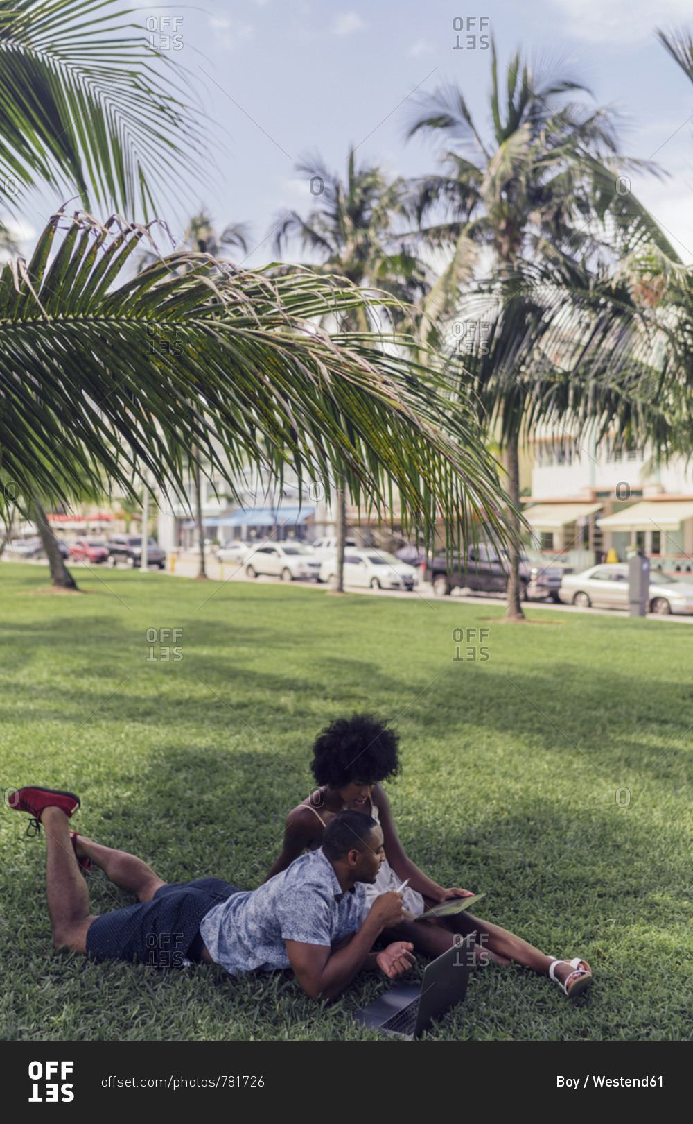 USA- Florida- Miami Beach- young couple using tablet and laptop on lawn in a park