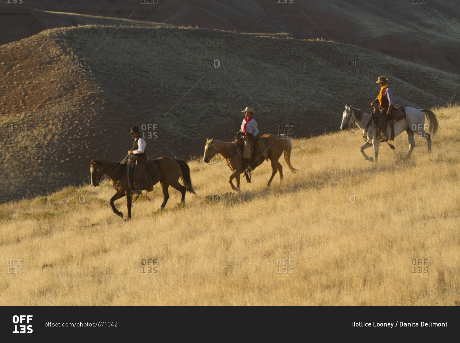 USA, Wyoming, Shell, The Hideout Ranch, Cowboys and Cowgirl Riding Horses in the Golden Light at End of Day