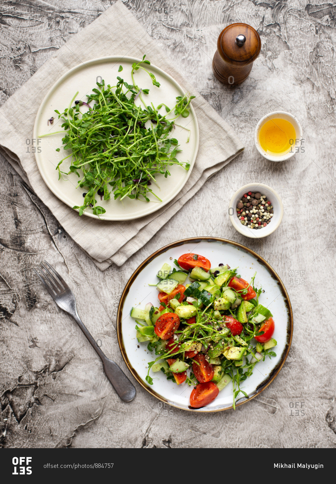 Vegetable salad with fresh tomatoes, avocado, cucumber and greens