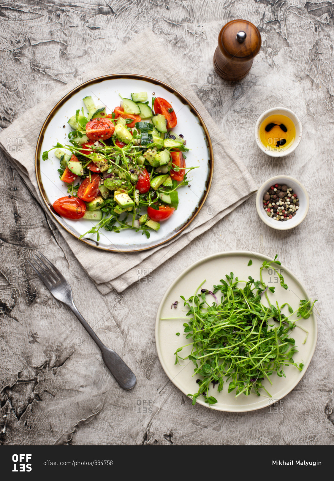 Vegetable salad with fresh tomatoes, avocado, cucumber and greens