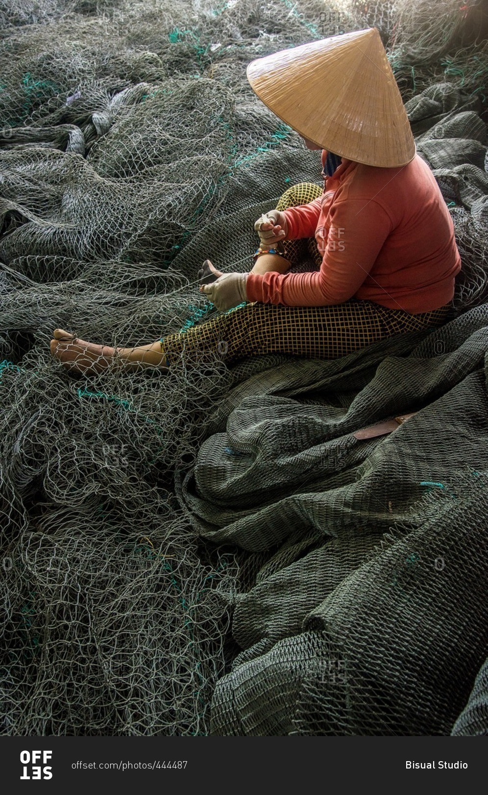 Vietnamese woman working on fishing net