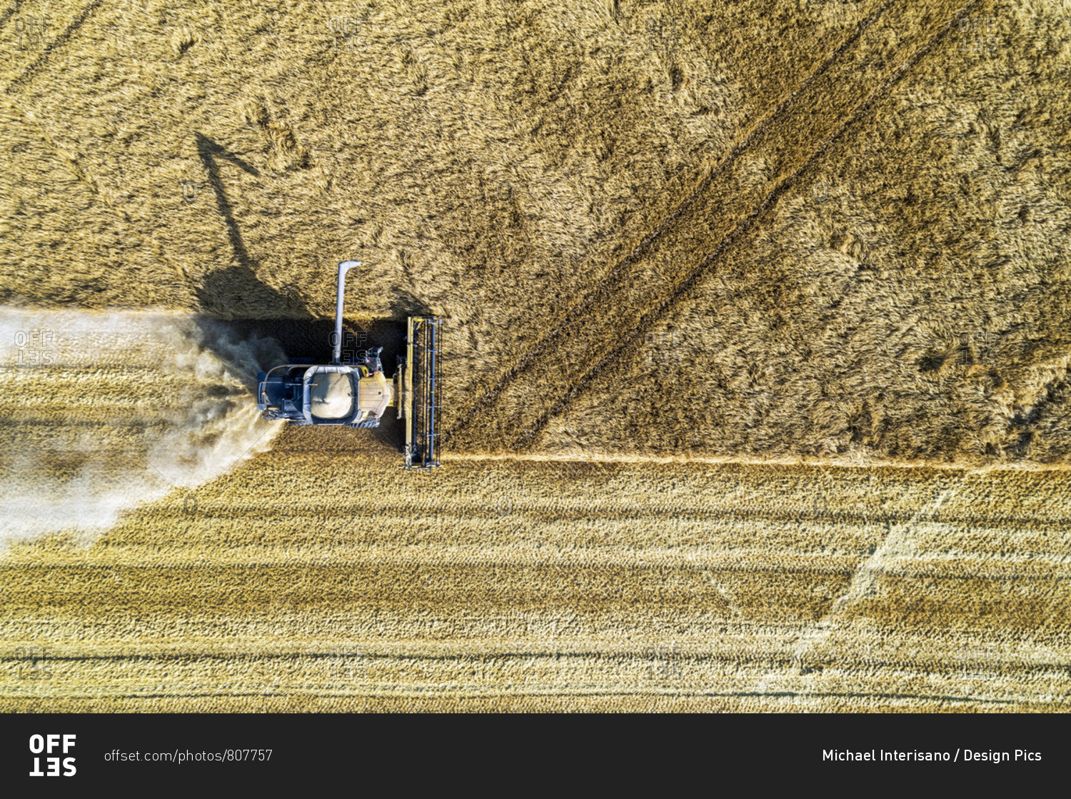 View from directly above of a combine cutting a barley field; Blackie, Alberta, Canada
