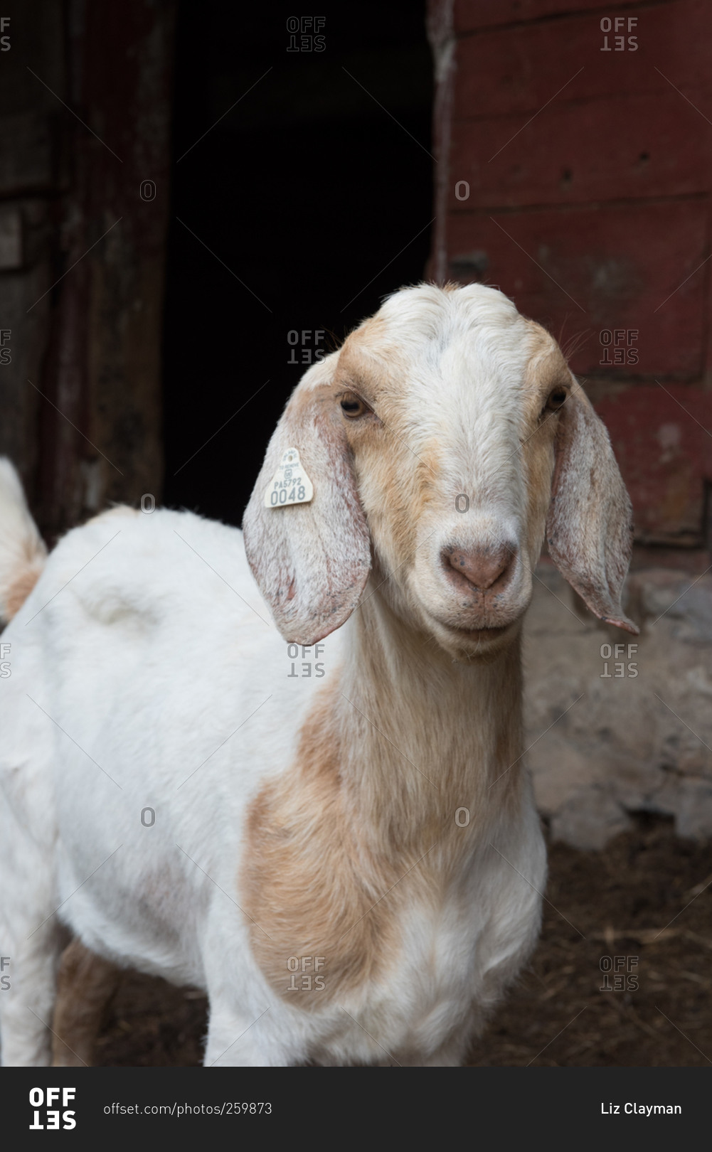 White and brown goat in a barnyard