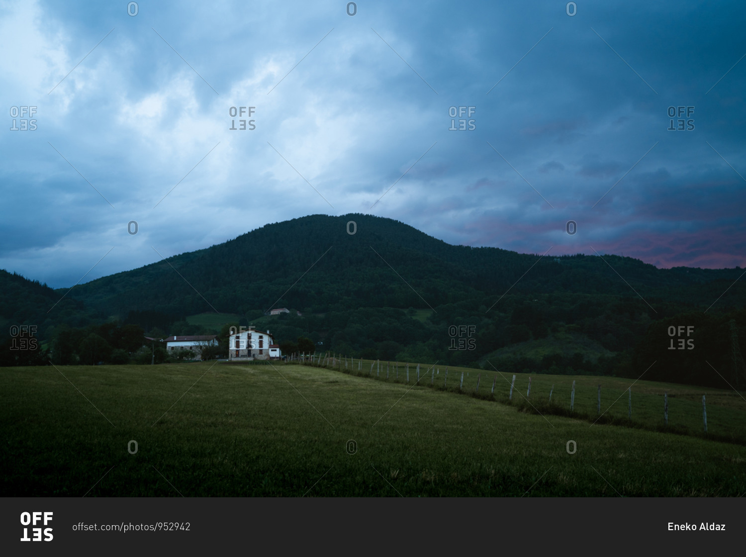 White farm in the Basque Country with dramatic clouds in the background