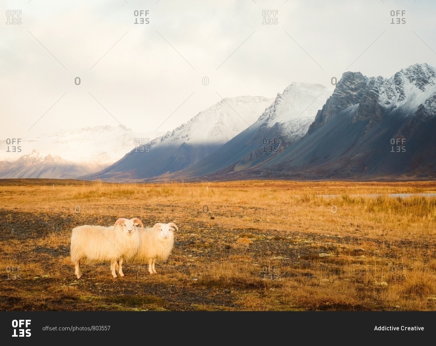 Wild sheep pasturing between dry meadow near high hills in Iceland