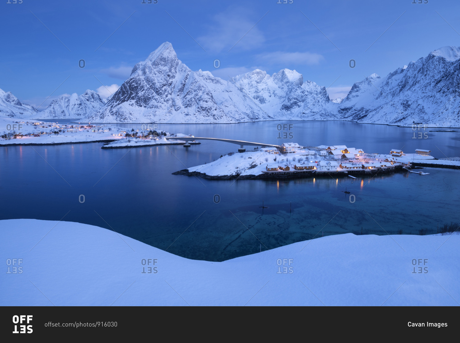 Winter twilight over Sakrisøy and Olstind mountain peak, Moskenesøy, Lofoten Islands, Norway