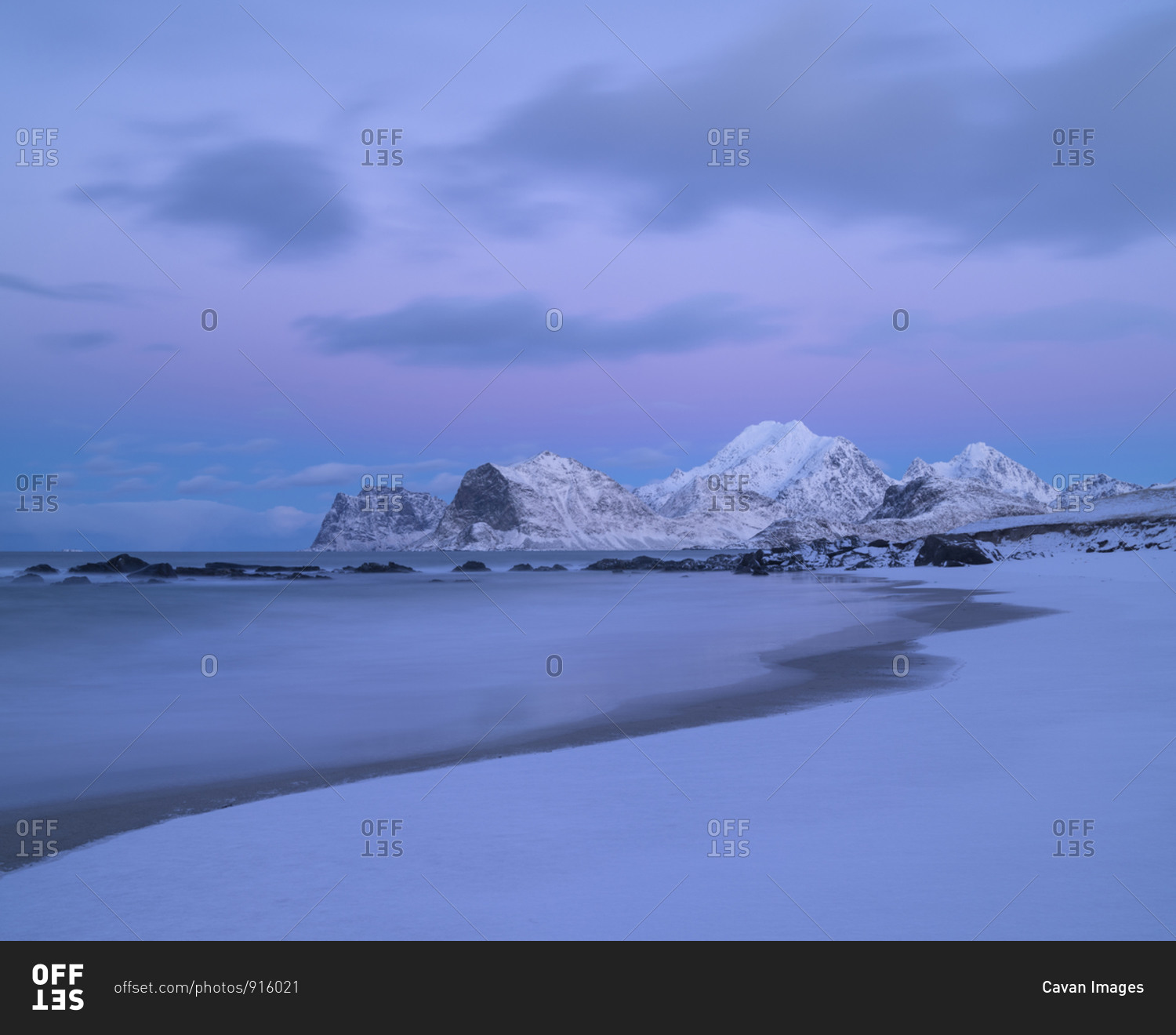 Winter twilight over snow covered Storsandnes beach, Flakstadøy, Lofoten Islands, Norway