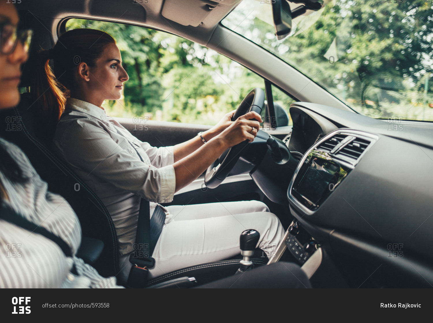 Woman driving a car with friend in front seat