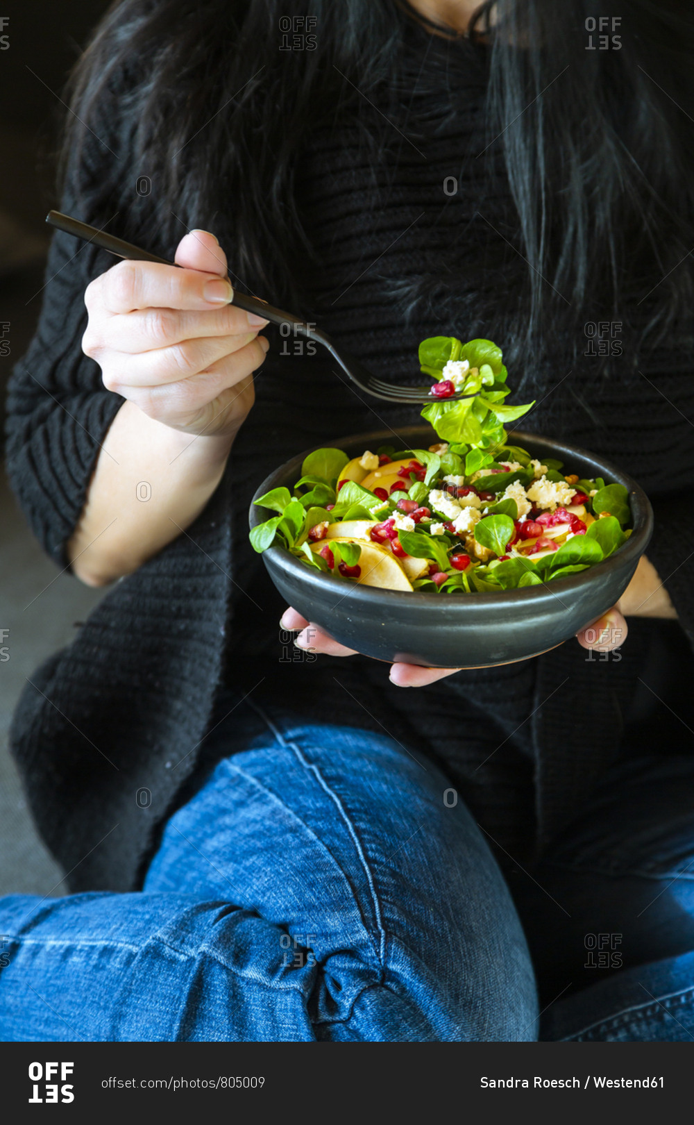 Woman eating mixed salad with lamb's lettuce- feta- pear- pomegranate seed and walnuts