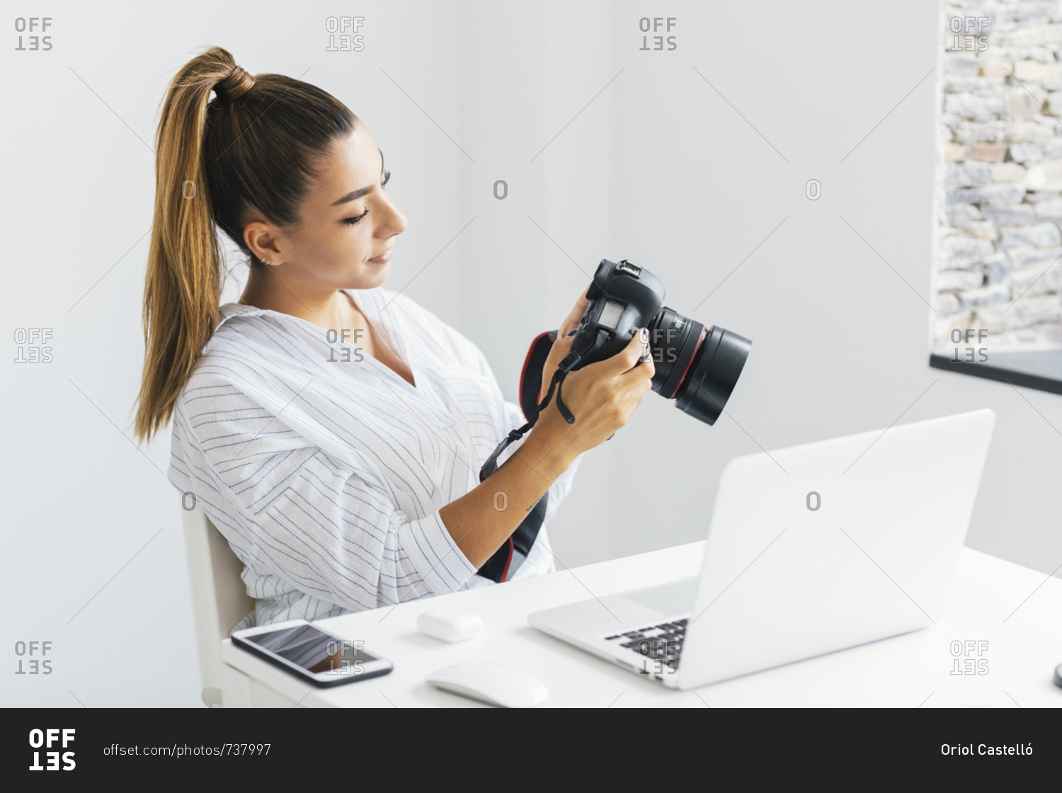 Woman holding and looking at digital camera while seated at desk in front of laptop computer