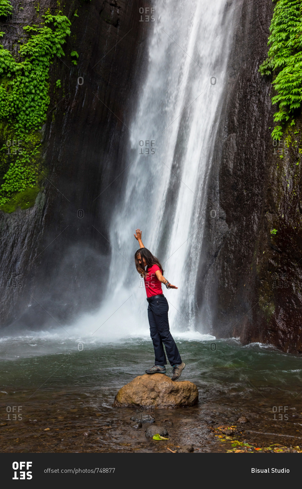 Woman in front of a waterfall in Bali, Indonesia