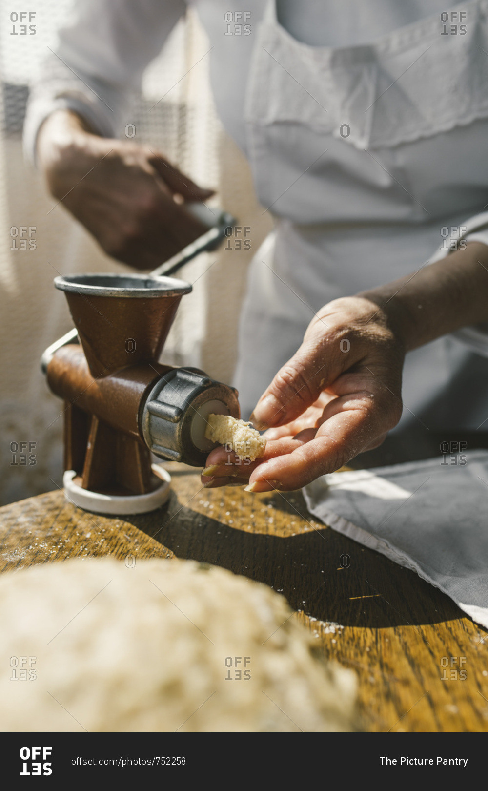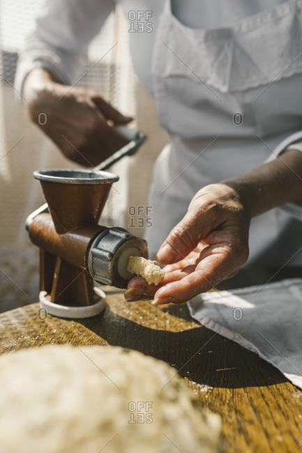 Woman Preparing Homemade Dough in the Kitchen and using a mincing machine. Preparation Raw Dough for Baking