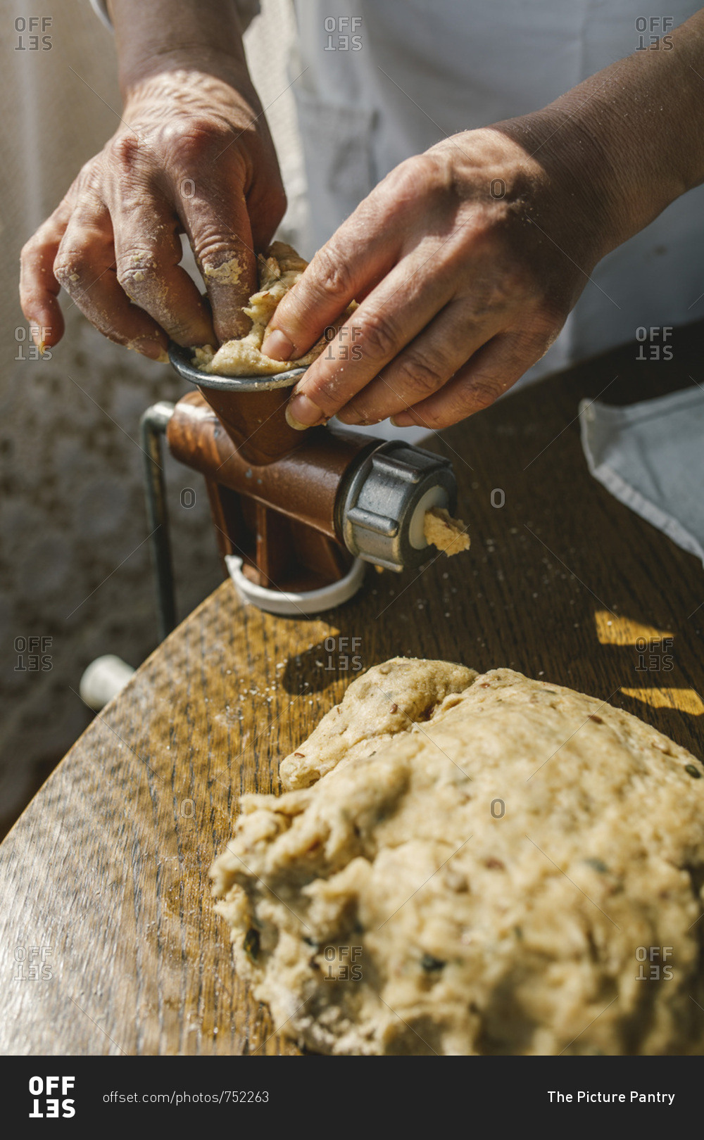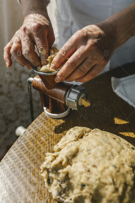 Woman Preparing Homemade Dough in the Kitchen and using a mincing machine. Preparation Raw Dough for Baking
