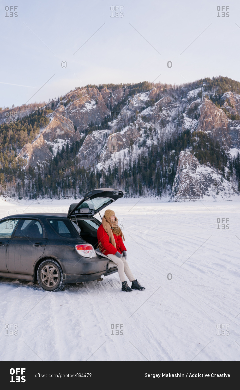 Woman sitting on car trunk in snowy valley