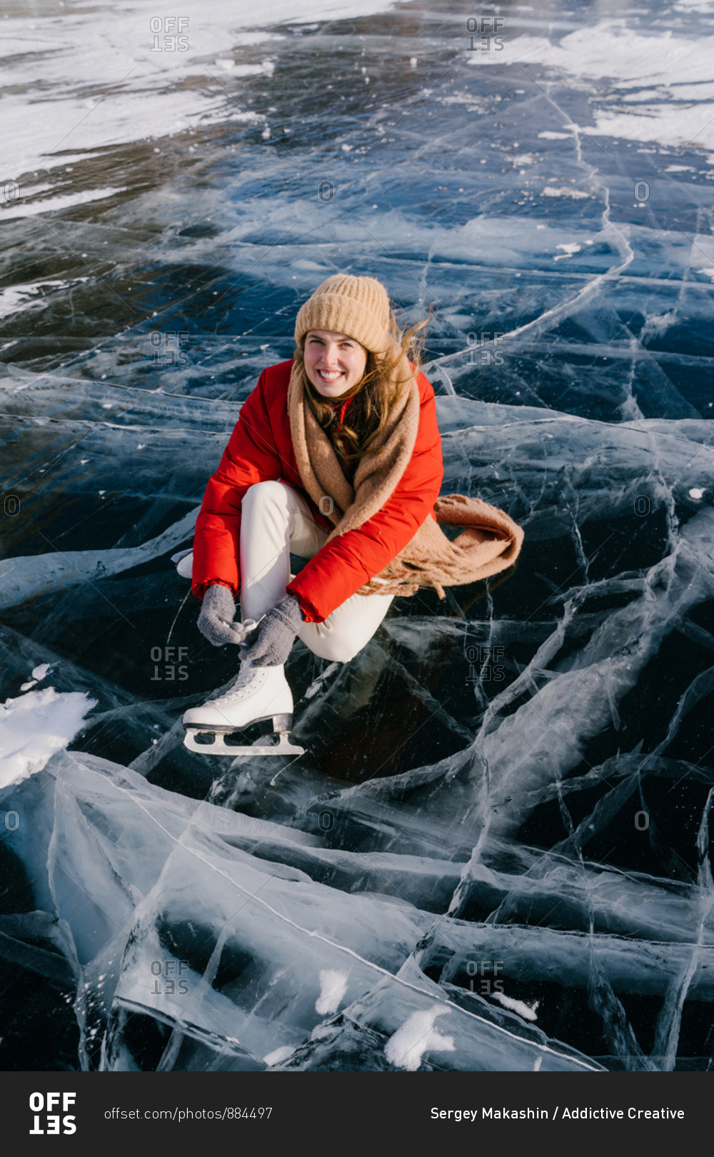 Woman sitting on frozen river and tying the shoelaces