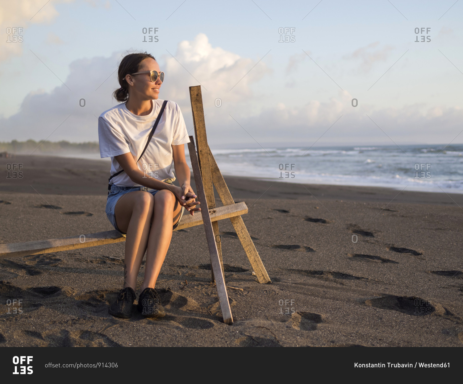 Woman sitting on rack on the beach at evening twilight- Kedungu beach- Bali- Indonesia