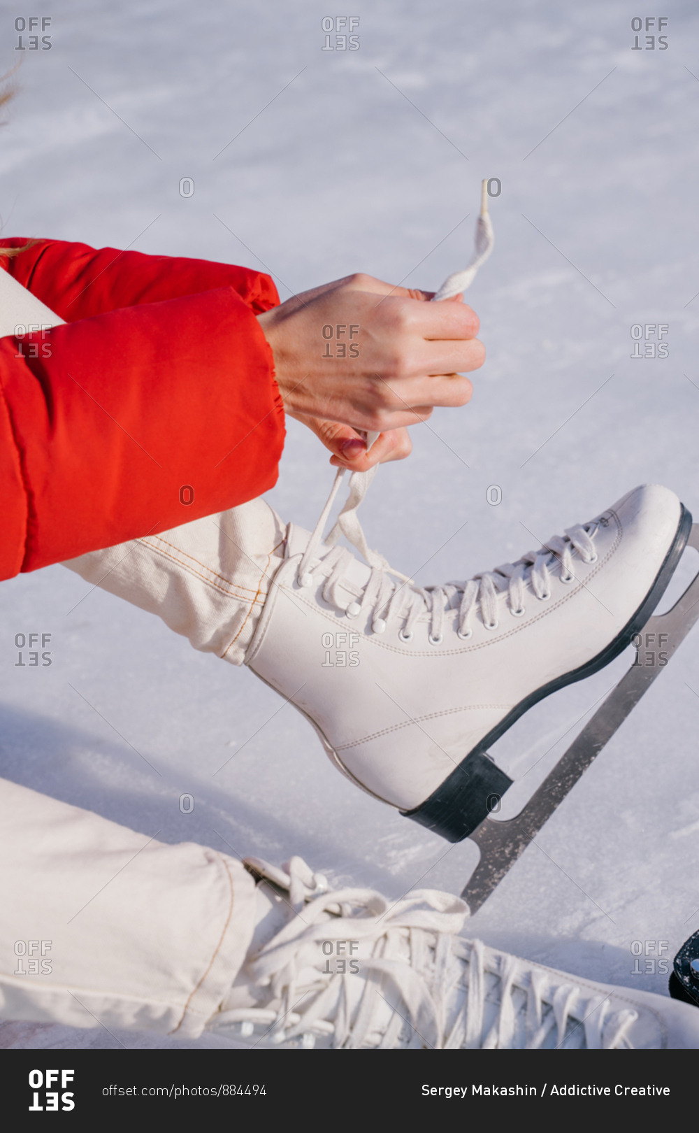 Woman sitting on snow and changing boots