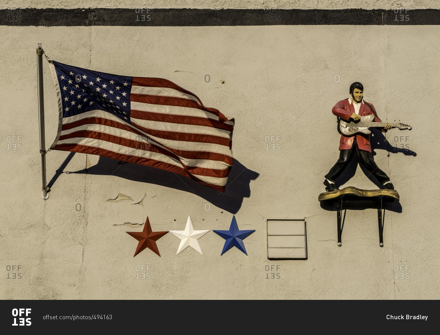 Yankton, South Dakota, USA - July 15, 2016: American flag and statue of Elvis on display on side of building