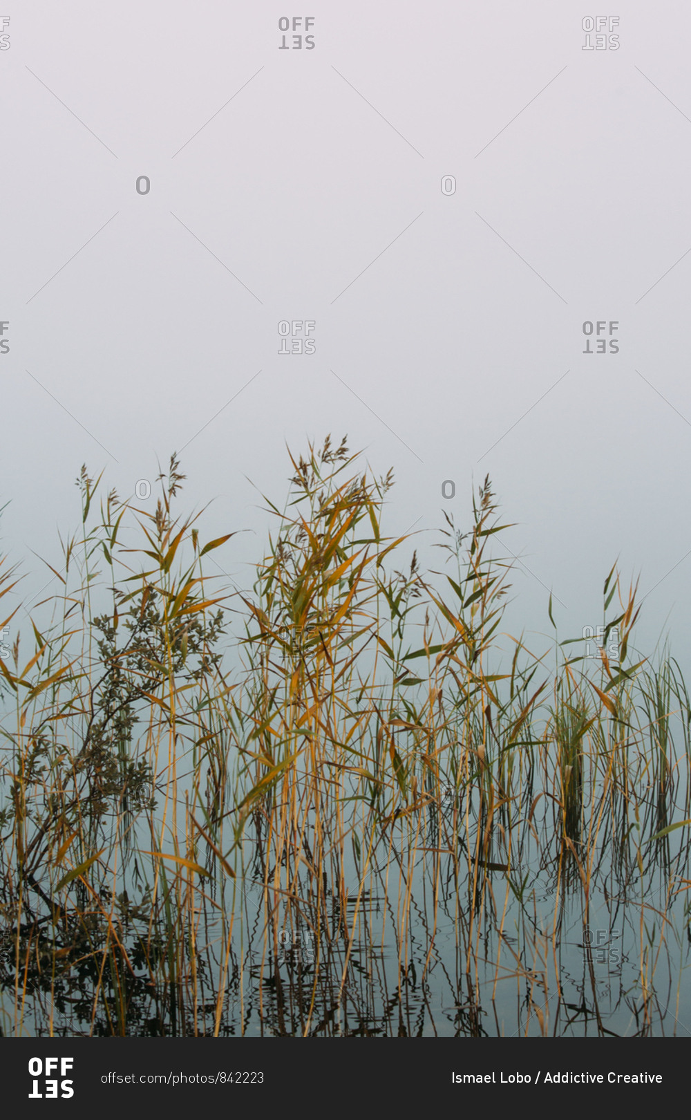 Yellow and green dried plants growing in swamp water on foggy day in finland
