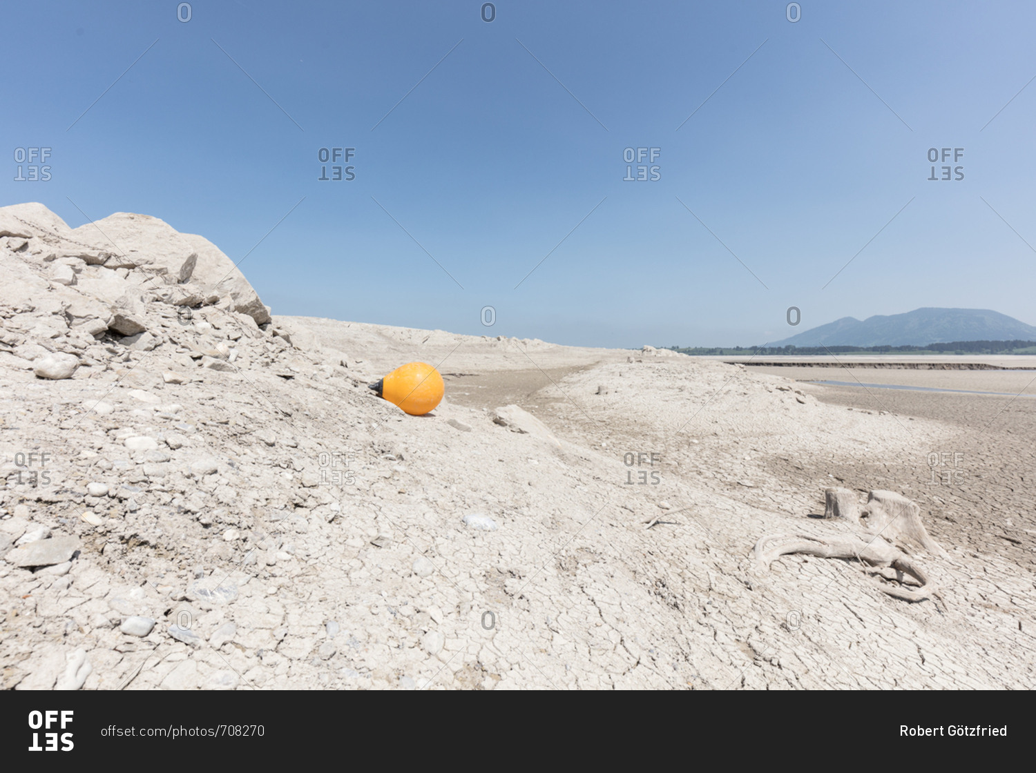 Yellow buoy lying next to tree stump on bed of arid dirt of lake Forggensee in Germany