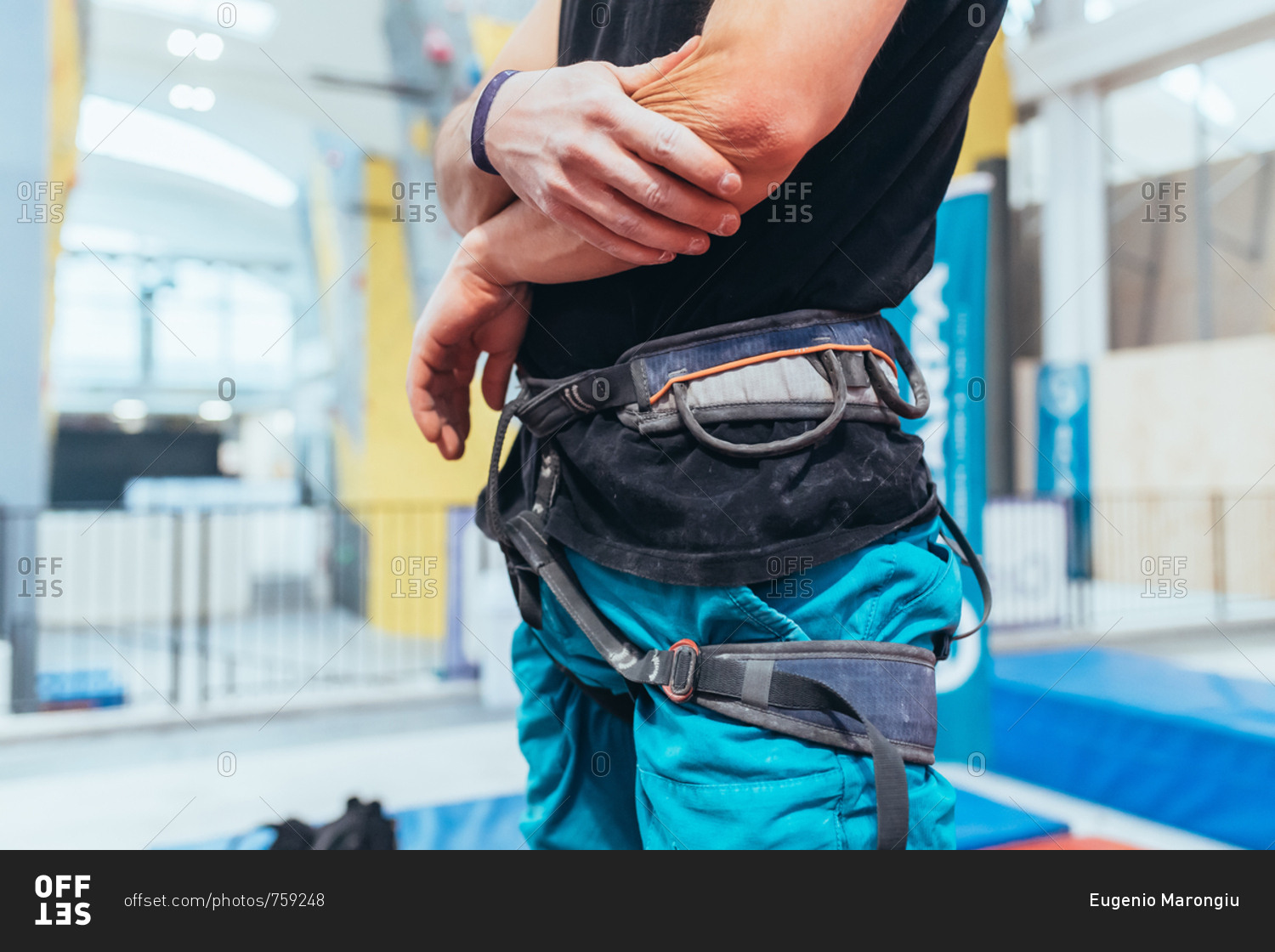 Young adult man and woman preparing with rope for climbing wall - exercise, preparation, sport concept