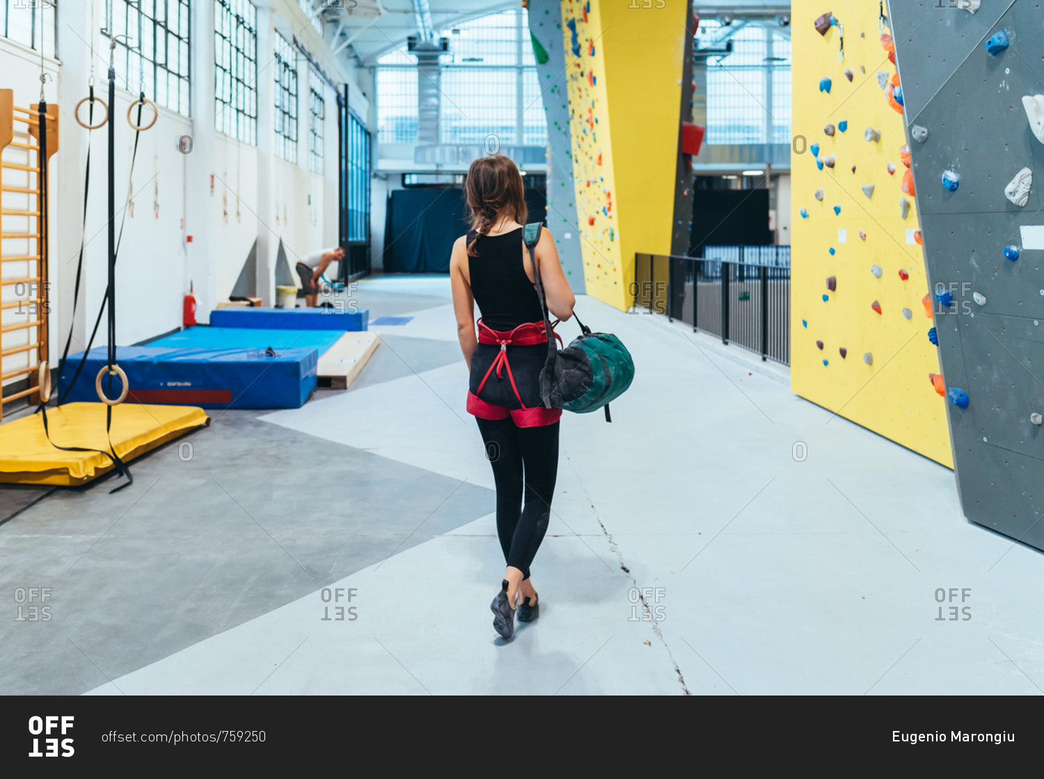 Young adult man and woman preparing with rope for climbing wall - exercise, preparation, sport concept