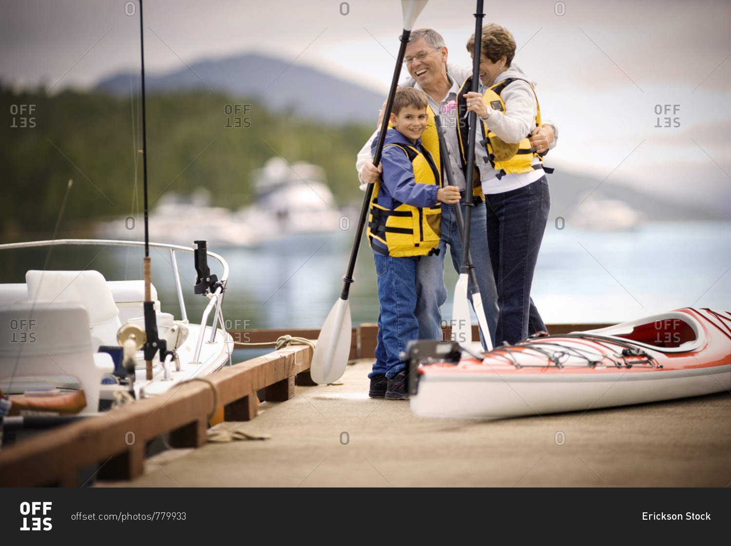 Young boy and his grandparents getting ready to go kayaking.