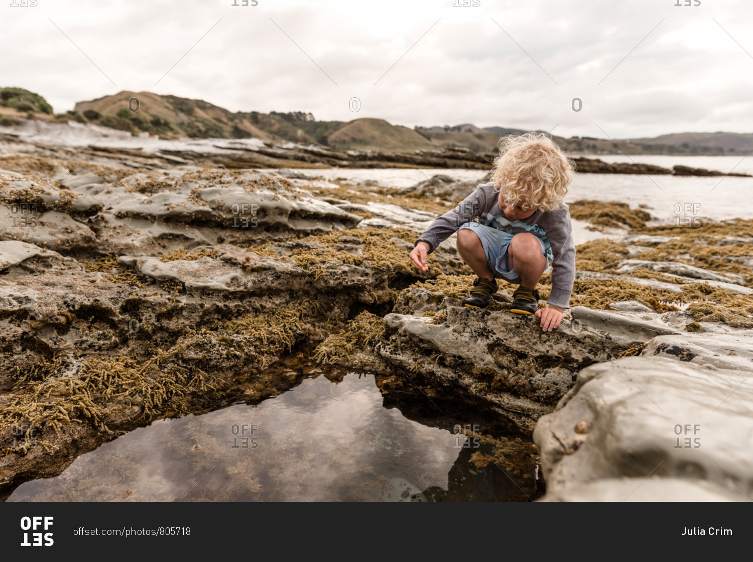 Young boy exploring algae and moss on tide pools by the bay
