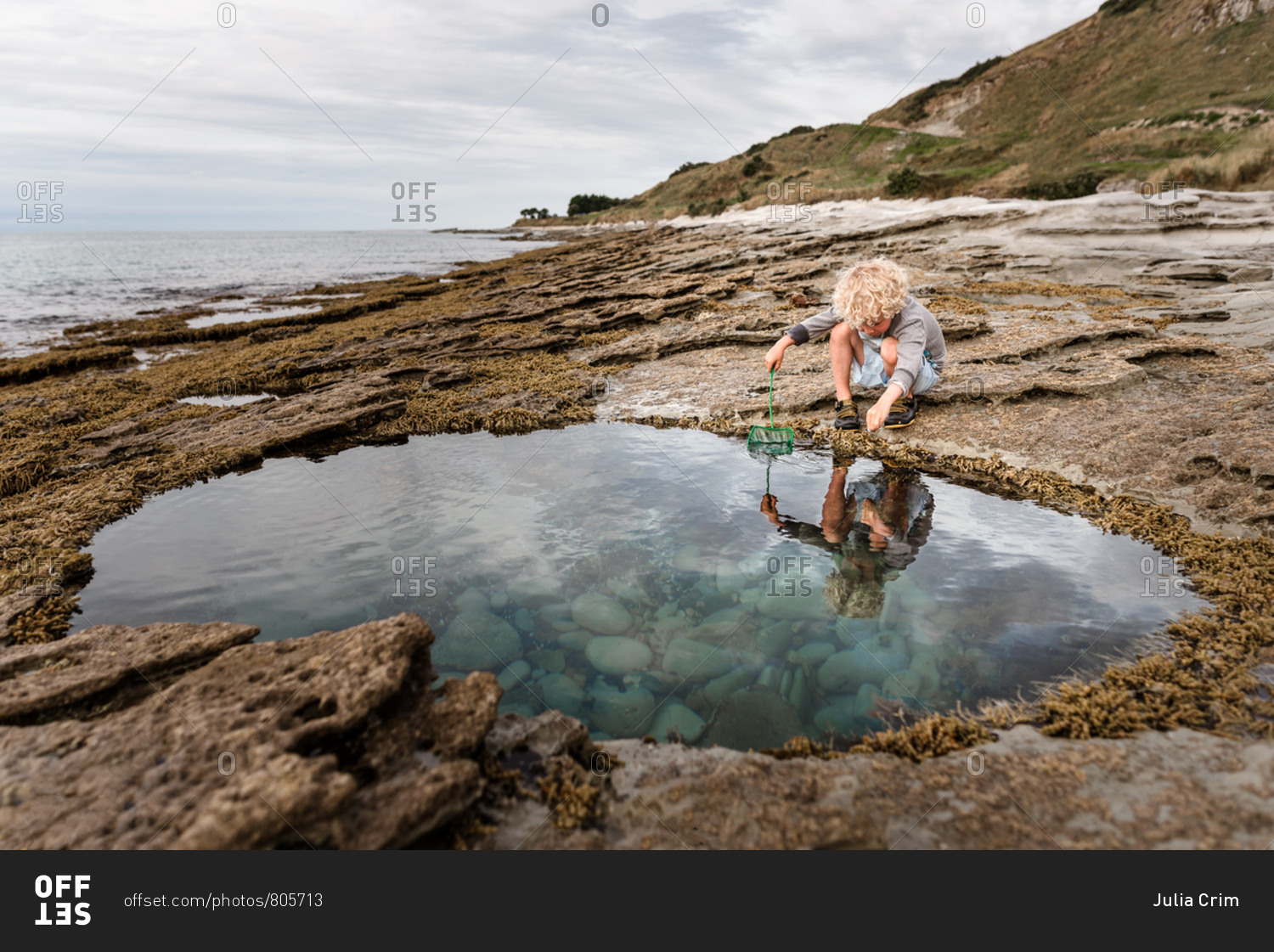 Young boy trawling a tide pool for treasure