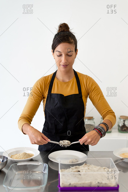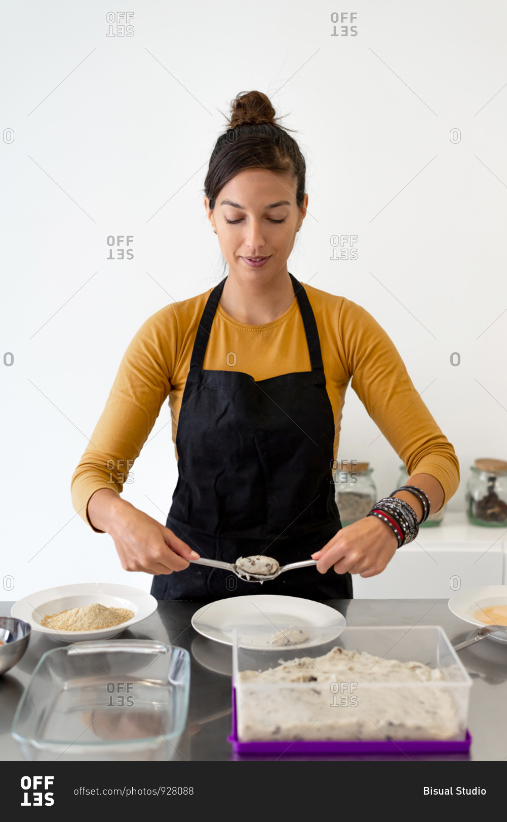 Young brunette woman with an apron cooking a homemade meal in a modern kitchen
