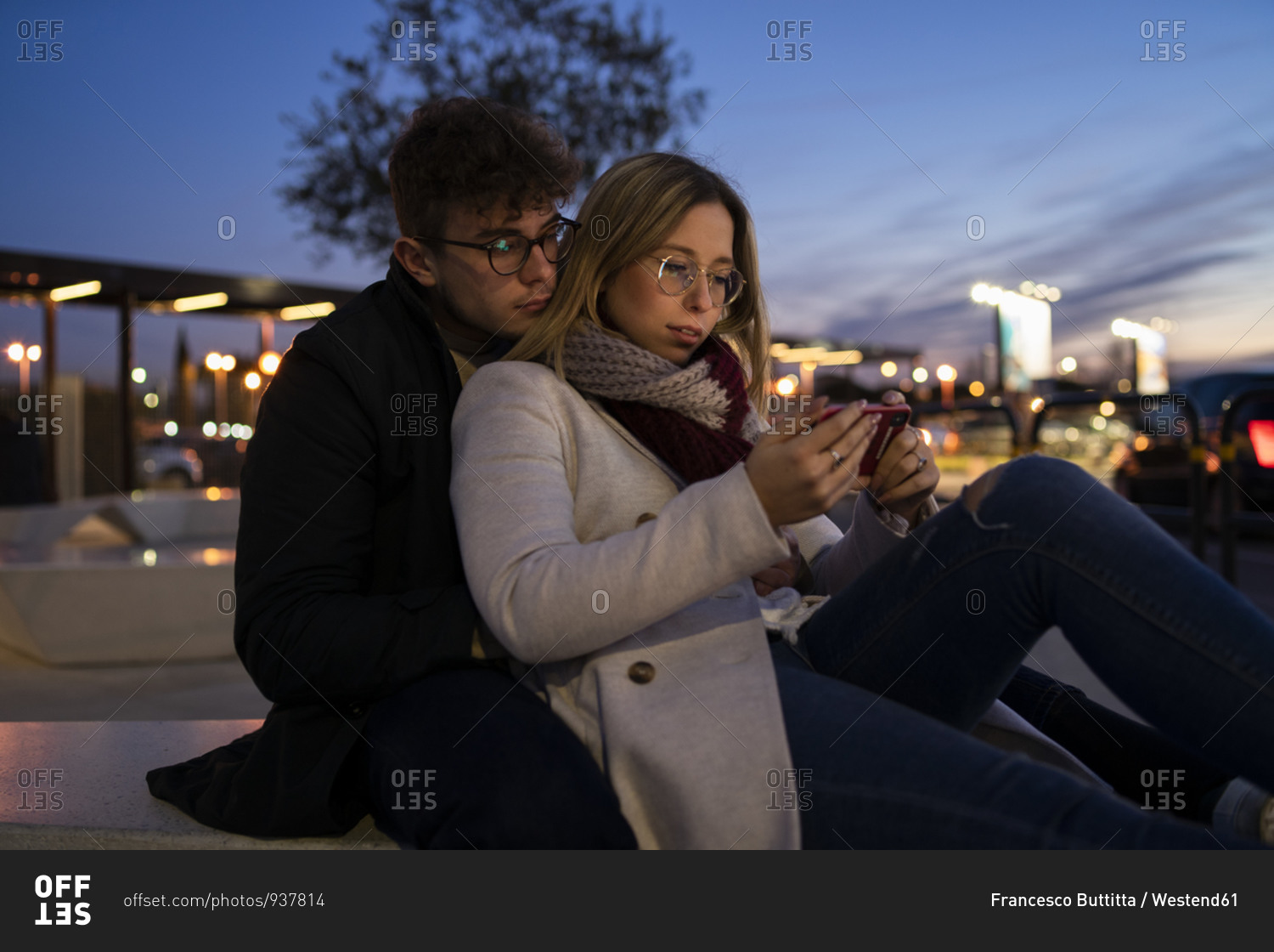 Young couple using smartphone at evening twilight