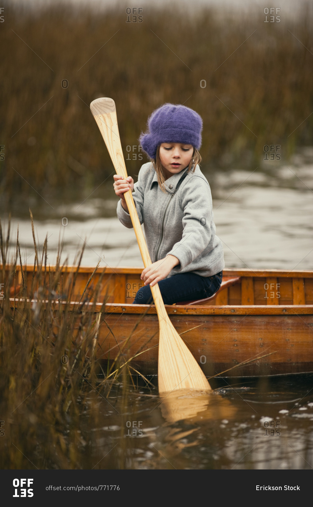 Young girl looks down as she tries to paddle a wooden canoe through reeds in a lake.