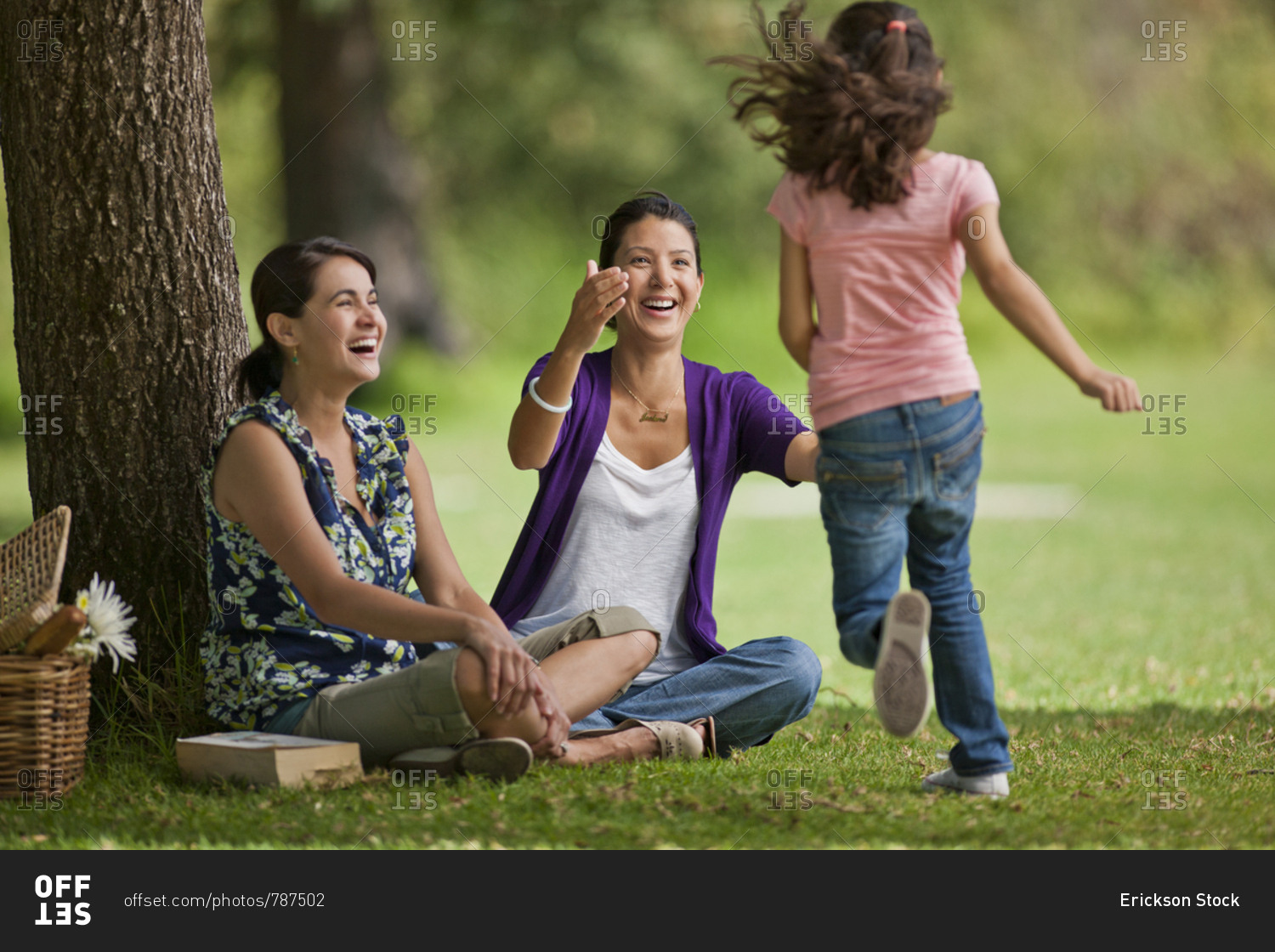 Young girl running towards her mother and a friend at the park.